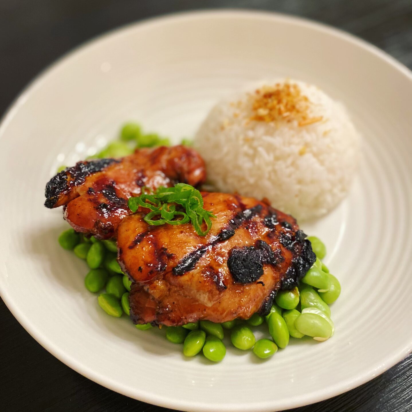 Marinated Chicken Thigh grilled to perfection served over Shelled Edamame’s and Jasmine Rice topped with Fried Garlic.